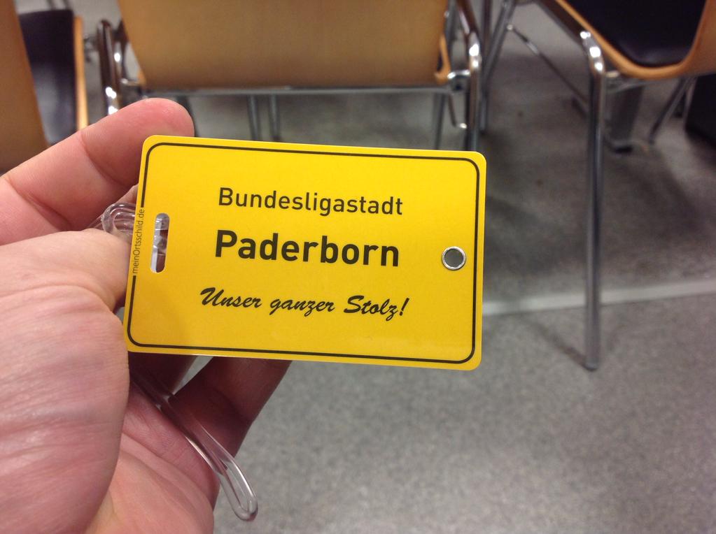 2012 war das. Eine Woche vor dem Heiligen Abend 2014 benutze ich auf der A33 zum zweiten Mal in meinem Leben die Ausfahrt Paderborn-Elsen. Es ist regnerisch draußen, ich erwarte diesmal ein Bundesligaspiel. „Bundesligastadt Paderborn“ – das steht auf den Stickern, die rund um das Stadion verteilt werden, und klingt immer noch ungewohnt. Den Berechtigungsschein für den Presseparkplatz gab’s per PDF.