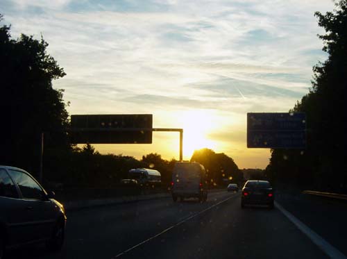 Richtung Duisburg, die Sonne geht über der Autobahn unter. Hole meine