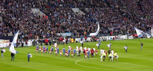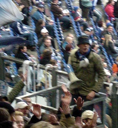 also sehr gefährlich. Abwechselnd laufen die Vereinslieder, von "Duisburg,