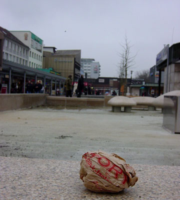 trostlose Fußgängerzone dieser seltsamen VW-Stadt. Graue Wolken